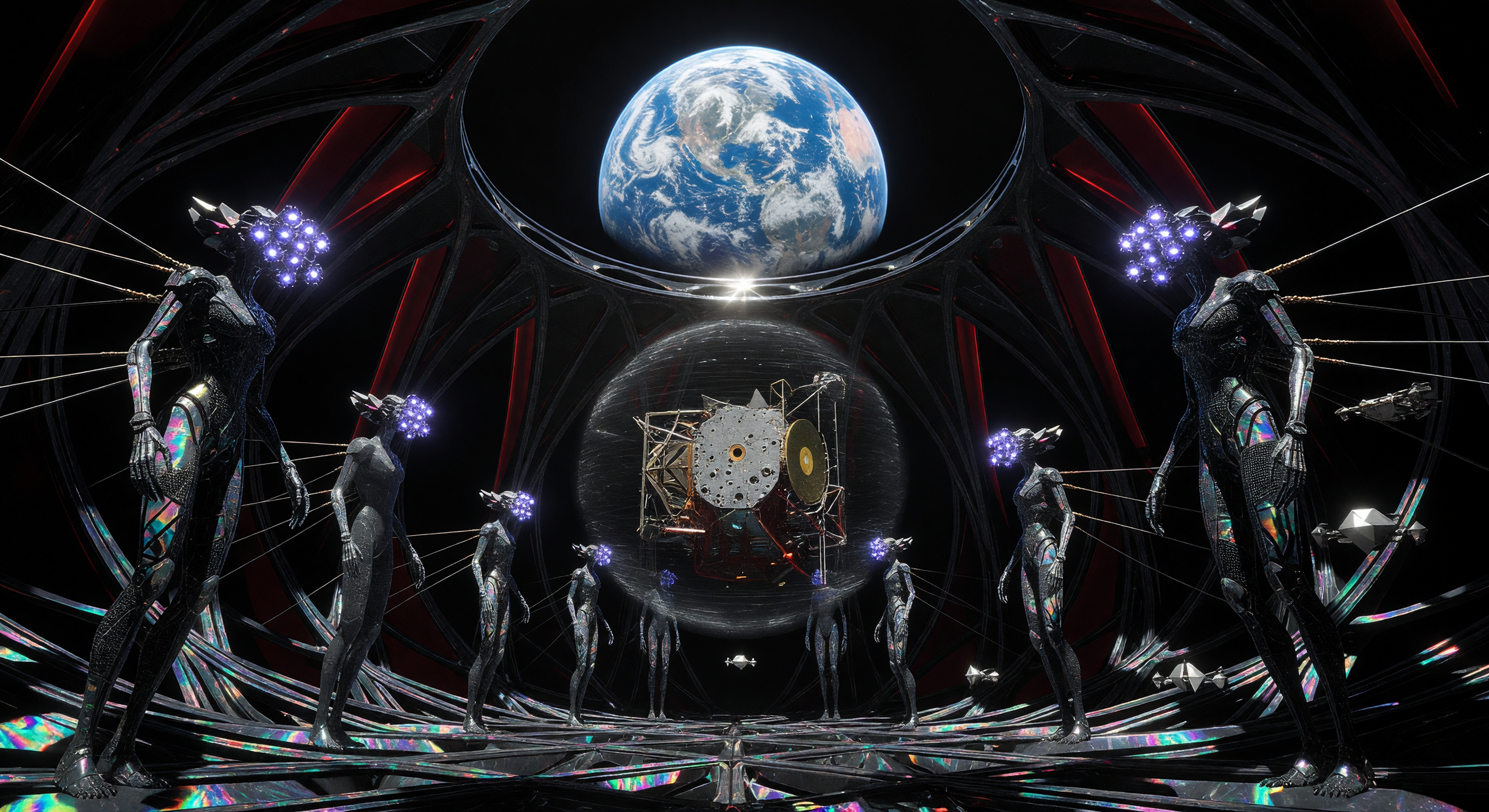 Image issues identified by one or more reviewers: 1) The scene does not clearly establish a lunar setting; there is no regolith, lunar surface, or other unmistakable Moon context, so the "lunar Sol-Archive" claim is not visually supported. 2) The central artifact is not clearly Voyager 1; it reads more like a generic probe, lander, or relay satellite, and its silhouette does not convincingly match Voyager 1's iconic parabolic antenna and instrument boom geometry. 3) The cathedral/dome architecture is not specifically identifiable as "diamondoid" or "carbon-lattice" from the image alone; those material claims are unsupported. 4) Grok considered the image fully acceptable, but the other reviewers noted the lack of lunar cues and the insufficiently recognizable Voyager 1 shape, so the image needs minor correction rather than replacement.