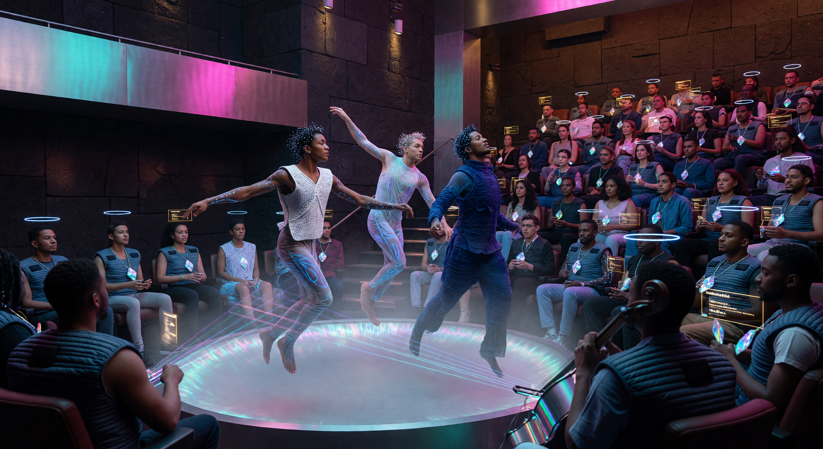 Set in the Lagos-Mumbai Axis circa 2042, this scene illustrates a low-gravity choreography performance within the subterranean theaters of the Threshold era. Dancers suspended in a localized 0.1g field wear a fusion of 4D-printed ceramics and carbon-negative myco-silk, their movements synchronized with subdermal luciferase tattoos that pulse to the rhythms of a laser-cello. This performance captures the "Great Bifurcation" of the mid-21st century, where an audience utilizing haptic-feedback vests and augmented-reality "Halos" experiences the dissolution of boundaries between biological organisms and digital interfaces.
