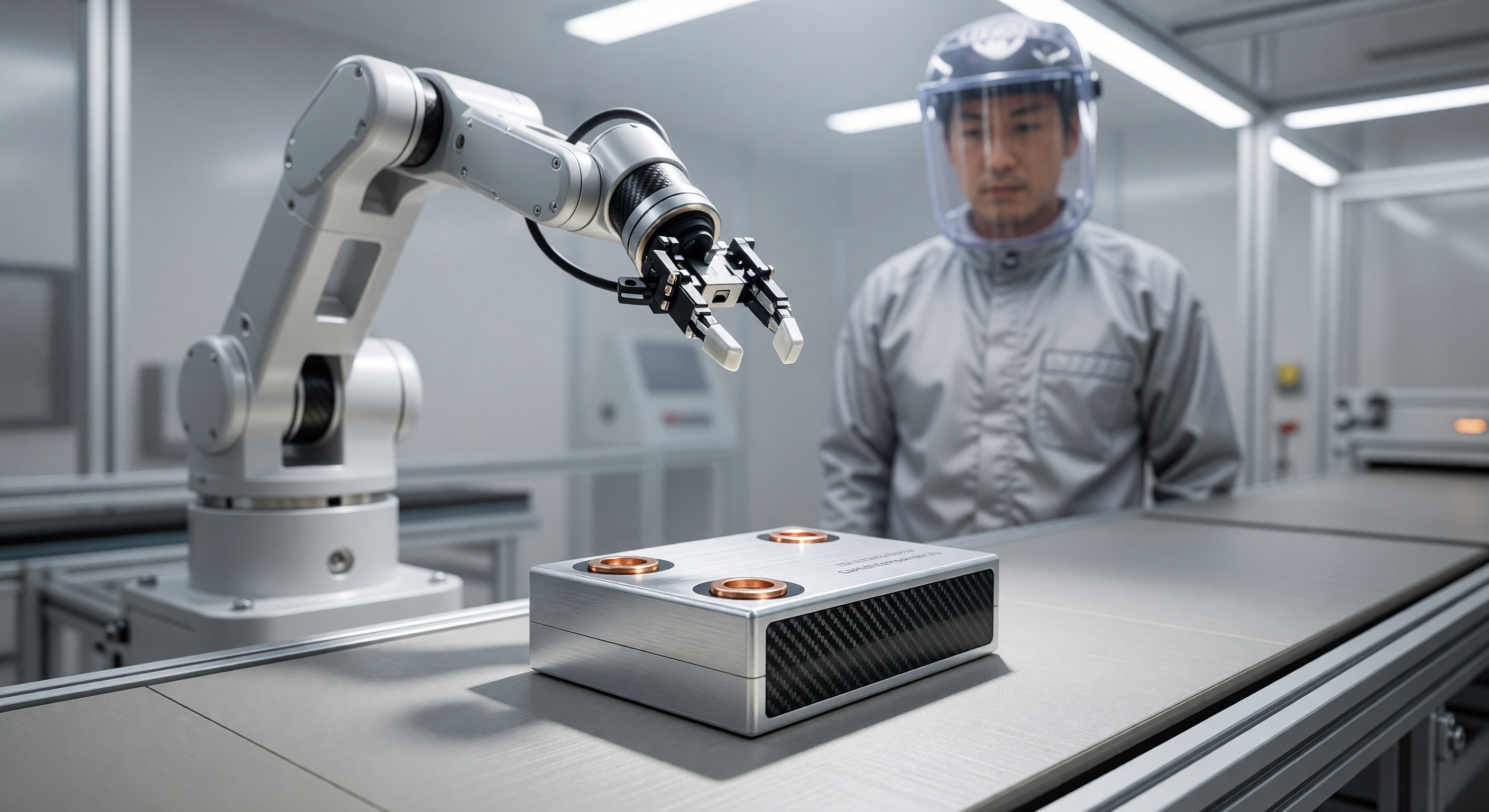 The image effectively captures a plausible 2035 high-precision assembly line in Nagoya, Japan. The cleanroom environment with glossy white floors, overhead lighting, and enclosed workstations aligns with advanced manufacturing facilities like those at Toyota or Panasonic. The worker's attire—gray cleanroom suit, face shield, and subtle Asian features—fits Japanese industrial culture without anachronisms. The robotic arm (collaborative cobot style, common since the 202s) interacting with a compact rectangular device showing brushed silver aluminum casing, black carbon fiber accents, and copper terminals visually matches the caption's materials (6061-T6 aluminum, recycled carbon fiber). No glaring inaccuracies in technology, architecture, or visuals; it's coherent, culturally appropriate for the region, and scientifically plausible for near-future battery production. Minor adjustments could add subtle Japanese signage or branding for stronger Nagoya specificity, but it's approvable as-is.