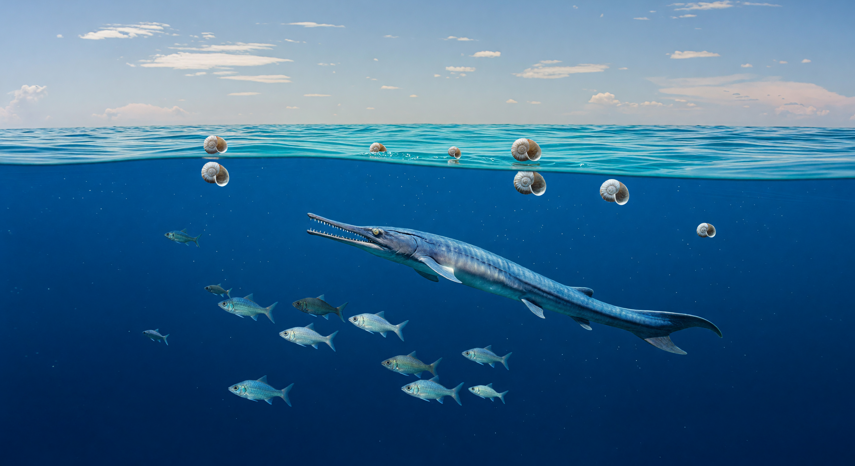 In the open waters of Triassic Panthalassa, about 247–237 million years ago, a long-bodied Cymbospondylus surges upward beneath a scattering school of Perleidus while small ribbed Trachyceras ammonoids drift near the sunlit surface. This scene captures an early stage in ichthyosaur evolution, when these marine reptiles were already formidable pelagic predators but still retained a more elongated, less tuna-like body than their later descendants. The immense blue expanse around them reflects the scale of Panthalassa, the vast global ocean that dominated Earth during the Middle Triassic.