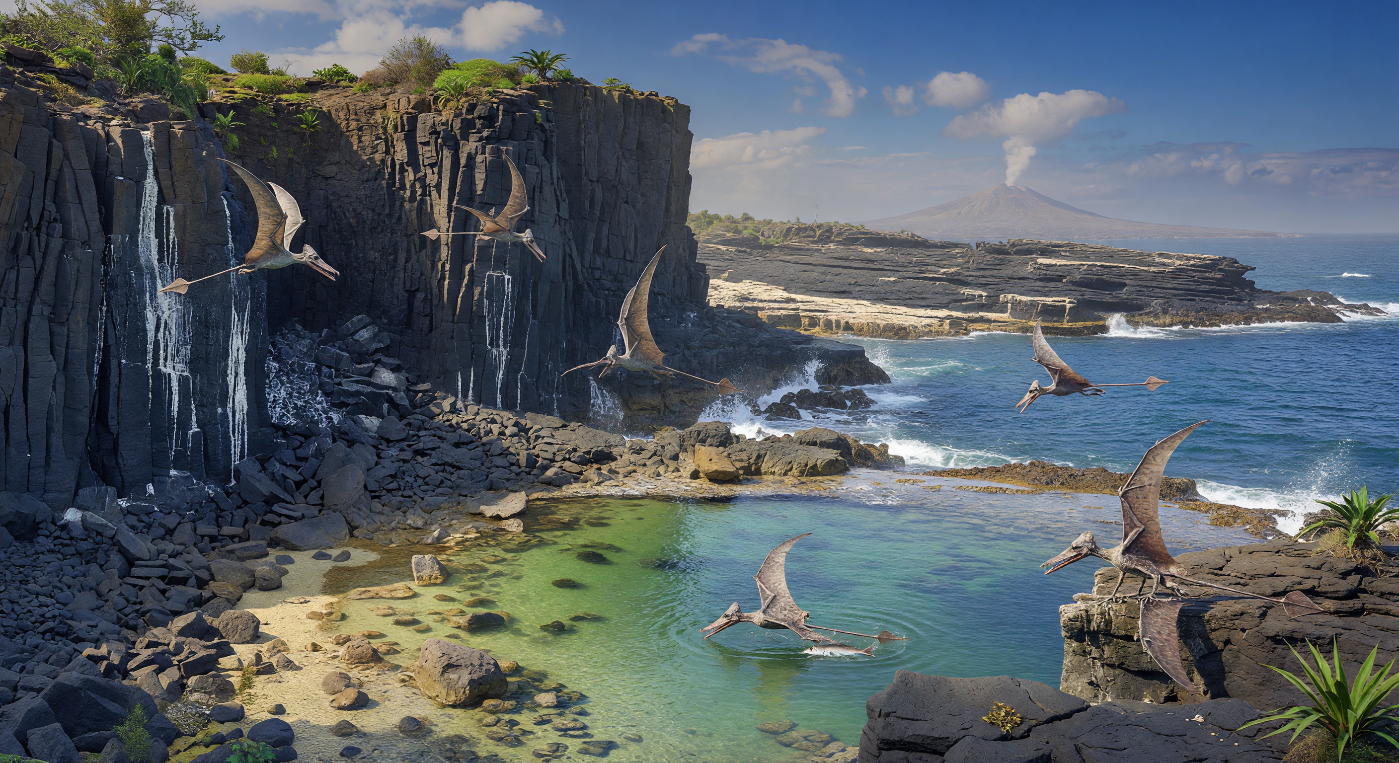 On a volcanic island coast of the Late Triassic, about 210 million years ago, small pterosaurs called Eudimorphodon soar along dark basalt cliffs above a shallow Panthalassan lagoon. With wingspans of roughly 1 metre, long vane-tipped tails, and distinctive multicusped teeth adapted for catching fish, these early fliers likely fed along warm coastal margins like this one. Sparse ferns, cycads, and conifer-like shrubs cling to the ledges, while guano-streaked rocks and an active island-arc volcano emphasize the dynamic setting of a Triassic ocean world.