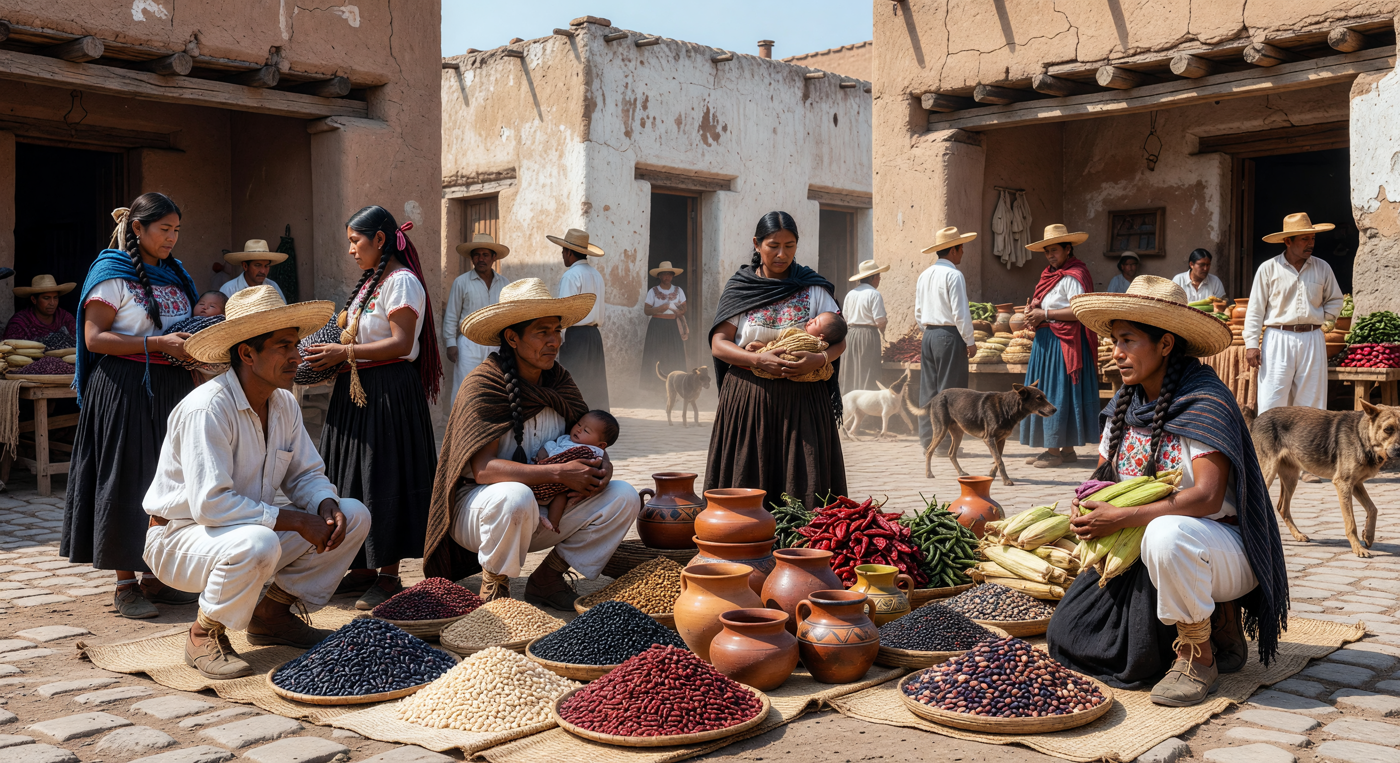 The image is highly accurate and plausible for a late 192s Mexican Central Highlands market during the post-revolutionary period. Adobe architecture with weathered walls, wooden door frames, and exposed beams is spot-on for rural highland villages like those in Oaxaca or Puebla. Clothing is culturally precise: men in white cotton manta shirts, loose calzones (drawstring trousers), and palm sombreros; women in dark skirts, rebozos (shawls), blouses, and braids—standard indigenous attire with no anachronisms like modern fabrics or synthetic dyes. Produce and goods (maize cobs, black/pinto beans, chiles, clay ollas on woven petate mats) reflect agrarian staples, with donkey and mixed-breed dogs adding authentic rural fauna. The cobblestone plaza is well-maintained but fits larger town markets (e.g., Oaxaca's), and the composition is coherent without AI artifacts beyond a minor crouched man with baby, which is plausible in family-run trade. No technology (e.g., no cars, electricity) or landscape issues; scientifically, highland flora/geology matches.